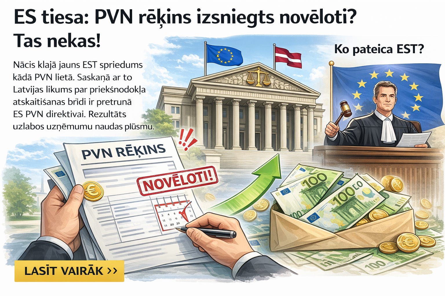 ES tiesa: PVN rēķins izsniegts novēloti? Tas nekas!Nācis klajā jauns EST spriedums kādā PVN lietā. Saskaņā ar to Latvijas likums par priekšnodokļa atskaitīšanas brīdi ir pretrunā ES PVN direktīvai. Rezultāts uzlabos uzņēmumu naudas plūsmu.Tax StoriesFeb 13, 2026∙ Paid1ShareSaturs:Ko pateica EST?Latvijas likums ir pretrunā PVN direktīvaiKādas tam sekas?Continue reading this post for free, courtesy of Tax Stories.Claim my free postOr purchase a paid subscription.PreviousNext