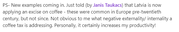 Iepriekš kafijas akcīzes sakarā jau pieskārāmies jautājumam - vai drīkst akcīzi piemērot objektam, kam īsti nav uzvedību koriģējoša pamatojuma?
