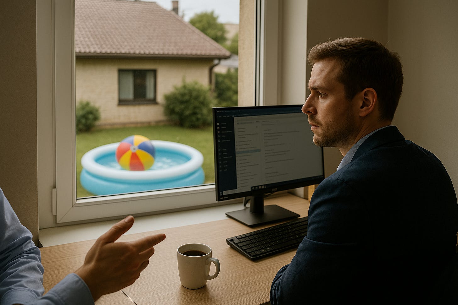 Izskatījās, ka vēja ārā nebija. Tomēr bija suģestējoši skatīties ārā pa VID ēkas logu uz blakus privātmājas bērnu baseiniņu. Tajā krāsaina, viegla bumba gumijas bumba dejoja pa baseina apli un vienlaikus griezās ap savu asi. Skaisti. Gluži kā plastmasas maisiņš leģendārajā filmā Amerikāņu skaistums.