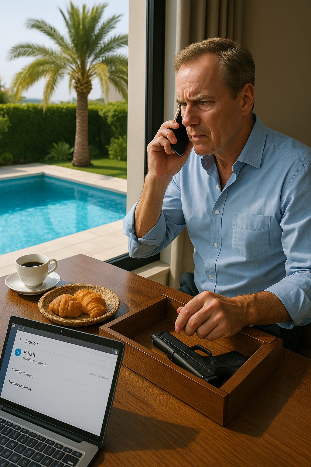 Kad Fišs beidza sarunu, Fēlikss beidzot paskatījās uz savu roku, kas neturēja telefonu. Tā joprojām trīcēja. Fēlikss visu laiku nenolaida acis no galda atvilktnē ieliktās jaunās pistoles. Stress bija tik milzīgs, ka visvairāk Fēlikss uztraucās, ka paņemot to rokā tā pati nejauši nospiedīs gaili. Aizverot galda atvilktni, Fēlikss vēlreiz uzgrieza Reno numuru.