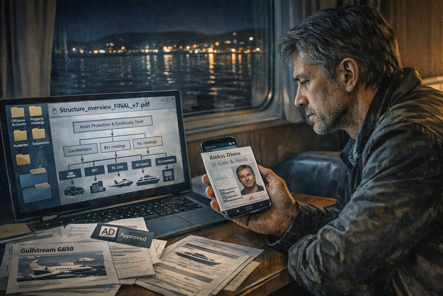 Marisa plāns izdevās perfekti. Reno šoreiz uzmanīgi vēroja vai neviens viņu neizseko. Lai gan viena ērta un ātra vilciena vietā bija divi lēnāki un vēl lēnāks ceļojums pa jūru, laiks bija tas, kas Reno šobrīd bija visvairāk vajadzīgs. Galvenokārt, lai mierīgi parakņātos pa Fēliksa telefonu. Izrādījās, ka tur ir, ko redzēt - telefonā bija tiešā pieeja mākonim. Ne jau Svētajam Pēterim, bet dokumentiem, kas glīti bija sakārtoti pa dažādām mapītēm. Jahtas, ofšori un pat (ak, Dievs!) pases kopijai, kur bildē nepārprotami bija redzams Fēlikss, bet blakus bildei rakstīts - Alekss Džons, St. Kitts & Nevis pilsonis.
