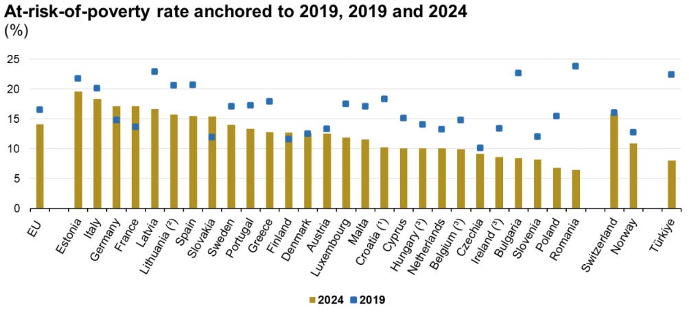 Turpmāk iekopētajā Eurostat tabulā redzams, ka uz nabadzības sliekšņa esošo proporcija kopš 2019.gada ir samazinājusies un mēs tuvojamies ES vidējiem rādītājiem. Ar valdības ieviesto EUR 1000 mēnesī ar IIN neapliekamo slieksni pensionāriem šī proporcija varētu mainīties vēl vairāk. Savukārt, nākamajā Eurostat grafikā redzams, ka pats nevienlīdzības koeficients joprojām pie mums ir salīdzinoši augsts.
